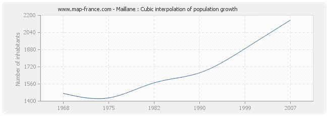 Population of Maillane was 2 156 inhabitants in 2007, 1 890 inhabitants in 1999, 1 664 inhabitants in 1990, 1 571 inhabitants in 1982, 1 430 inhabitants in 1975 and 1 472 inhabitants in 1968.