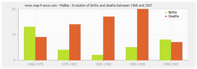 Population of Maillas was 114 inhabitants in 2007, 102 inhabitants in 1999, 122 inhabitants in 1990, 127 inhabitants in 1982, 162 inhabitants in 1975 and 175 inhabitants in 1968.