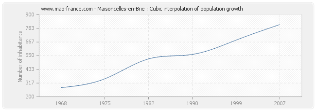 This curve shows the history of the population of Maisoncelles-en-Brie from 1968 to 2007 in cubic interpolation. This provides more precisely the population of the municipality of Maisoncelles-en-Brie the years where no census has been taken.