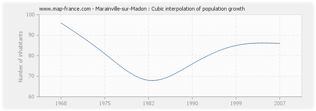 This curve shows the history of the population of Marainville-sur-Madon from 1968 to 2007 in cubic interpolation. This provides more precisely the population of the municipality of Marainville-sur-Madon the years where no census has been taken.