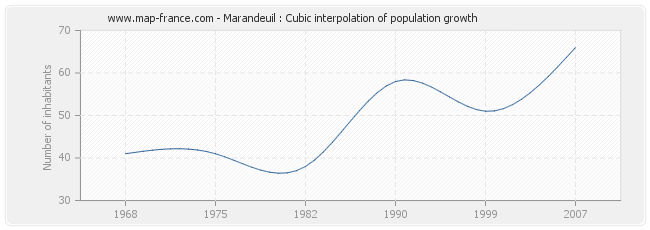 This curve shows the history of the population of Marandeuil from 1968 to 2007 in cubic interpolation. This provides more precisely the population of the municipality of Marandeuil the years where no census has been taken.