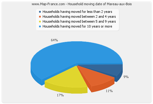 - Number of households of Mareau-aux-Bois having moved between 2 and 5 years : 23 - Number of households of Mareau-aux-Bois having moved between 5 and 9 years : 37 - Number of households of Mareau-aux-Bois having moved for 10 years or more : 138 |