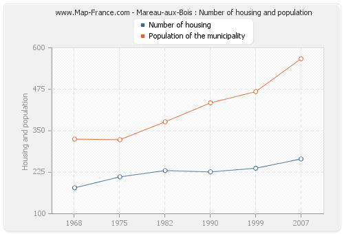 The population of Mareau-aux-Bois was 567 inhabitants in 2007, 468 inhabitants in 1999, 434 inhabitants in 1990, 377 inhabitants in 1982, 323 inhabitants in 1975 and 325 inhabitants in 1968. Meanwhile, the number of housing of Mareau-aux-Bois was 265 in 2007, 237 in 1999, 226 in 1990, 230 in 1982, 211 in 1975 and 178 in 1968.