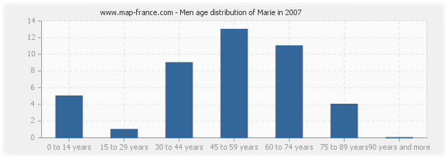 - Population of Marie from 60 to 74 years : 13 inhabitants