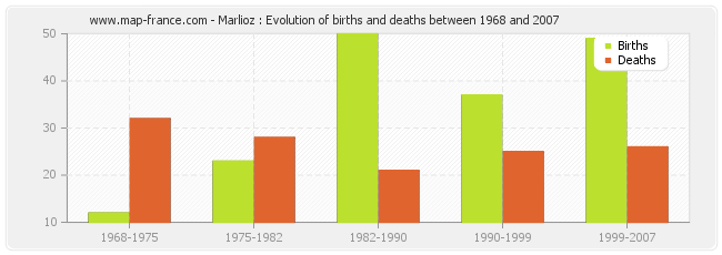Marlioz : evolution of births and deaths from 1968 to 2007