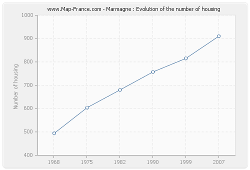 The number of housing of Marmagne was 910 in 2007, 815 in 1999, 757 in 1990, 680 in 1982, 604 in 1975 and 494 in 1968.