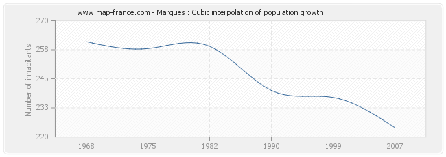 Population of Marques was 224 inhabitants in 2007, 237 inhabitants in 1999, 240 inhabitants in 1990, 259 inhabitants in 1982, 258 inhabitants in 1975 and 261 inhabitants in 1968.