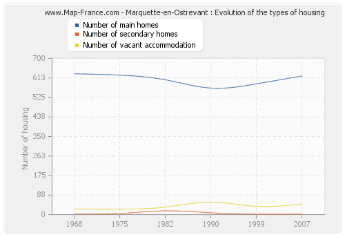 In 2007 the accommodations of Marquette-en-Ostrevant consisted of 621 main homes, 2 second homes and 48 vacant accommodations.