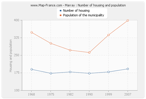 The population of Marray was 399 inhabitants in 2007, 337 inhabitants in 1999, 262 inhabitants in 1990, 272 inhabitants in 1982, 301 inhabitants in 1975 and 348 inhabitants in 1968. Meanwhile, the number of housing of Marray was 192 in 2007, 179 in 1999, 173 in 1990, 179 in 1982, 173 in 1975 and 190 in 1968.