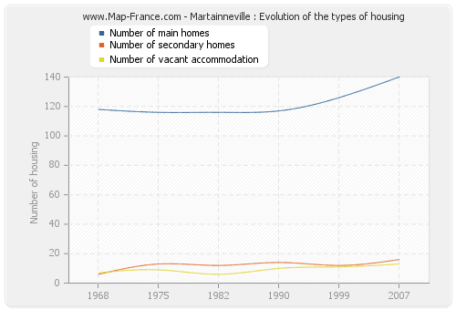 The following graphs show the history of the number and the type of housing of Martainneville from 1968 to 2007. The second graph is drawn in cubic interpolation. This allows to obtain more exactly the number of accommodation of the town of Martainneville years where no inventory was made.