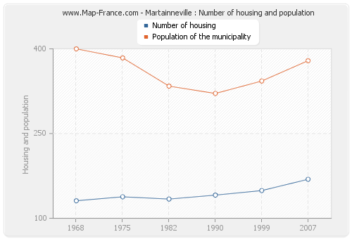 The population of Martainneville was 379 inhabitants in 2007, 343 inhabitants in 1999, 321 inhabitants in 1990, 334 inhabitants in 1982, 384 inhabitants in 1975 and 400 inhabitants in 1968. Meanwhile, the number of housing of Martainneville was 169 in 2007, 149 in 1999, 141 in 1990, 134 in 1982, 138 in 1975 and 131 in 1968.
