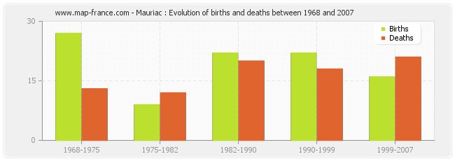 Population of Mauriac was 243 inhabitants in 2007, 225 inhabitants in 1999, 230 inhabitants in 1990, 228 inhabitants in 1982, 219 inhabitants in 1975 and 264 inhabitants in 1968.