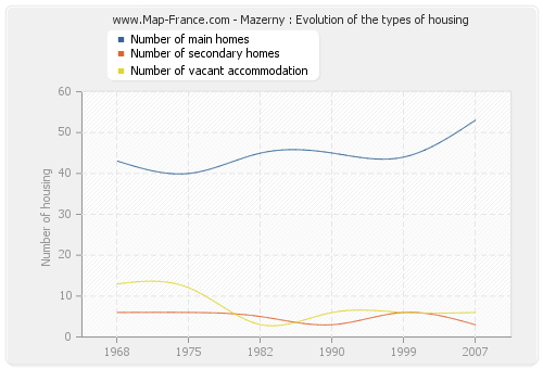 The number of housing of Mazerny was 62 in 2007, 56 in 1999, 54 in 1990, 53 in 1982, 58 in 1975 and 62 in 1968.