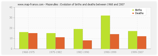 Mazerulles : evolution of births and deaths from 1968 to 2007