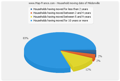 - Number of households of Médonville having moved between 2 and 5 years : 1 - Number of households of Médonville having moved between 5 and 9 years : 5 - Number of households of Médonville having moved for 10 years or more : 34 |