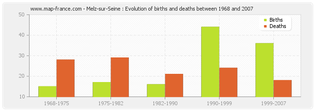 Melz-sur-Seine : evolution of births and deaths from 1968 to 2007