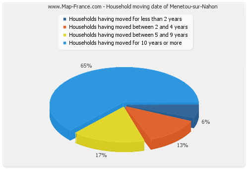 - Number of households of Menetou-sur-Nahon having moved between 2 and 5 years : 6 - Number of households of Menetou-sur-Nahon having moved between 5 and 9 years : 8 - Number of households of Menetou-sur-Nahon having moved for 10 years or more : 31 |