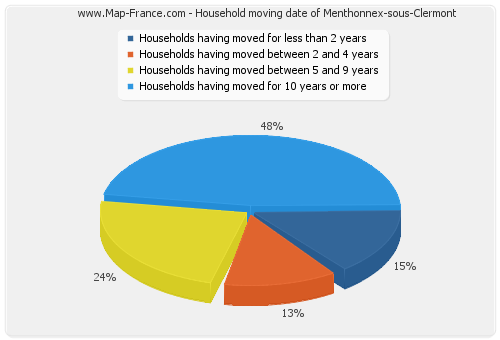 - Number of households of Menthonnex-sous-Clermont having moved between 2 and 5 years : 29 - Number of households of Menthonnex-sous-Clermont having moved between 5 and 9 years : 54 - Number of households of Menthonnex-sous-Clermont having moved for 10 years or more : 108 |