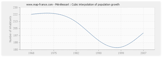This curve shows the history of the population of Mérélessart from 1968 to 2007 in cubic interpolation. This provides more precisely the population of the municipality of Mérélessart the years where no census has been taken.