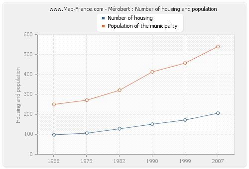 The population of Mérobert was 540 inhabitants in 2007, 457 inhabitants in 1999, 413 inhabitants in 1990, 321 inhabitants in 1982, 271 inhabitants in 1975 and 250 inhabitants in 1968. Meanwhile, the number of housing of Mérobert was 206 in 2007, 172 in 1999, 151 in 1990, 128 in 1982, 106 in 1975 and 98 in 1968.