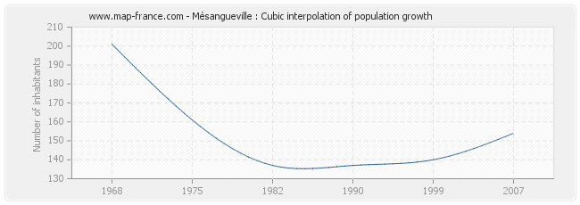 This curve shows the history of the population of Mésangueville from 1968 to 2007 in cubic interpolation. This provides more precisely the population of the municipality of Mésangueville the years where no census has been taken.