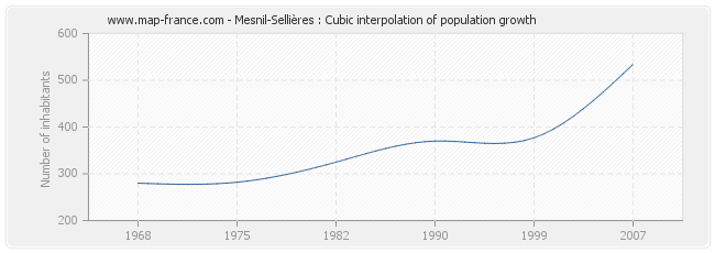 Population of Mesnil-Sellières was 534 inhabitants in 2007, 377 inhabitants in 1999, 370 inhabitants in 1990, 325 inhabitants in 1982, 282 inhabitants in 1975 and 280 inhabitants in 1968.