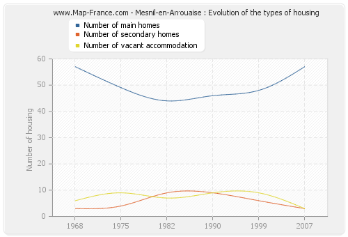 The number of housing of Mesnil-en-Arrouaise was 63 in 2007, 63 in 1999, 64 in 1990, 60 in 1982, 62 in 1975 and 66 in 1968.