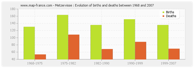 Metzervisse : evolution of births and deaths from 1968 to 2007