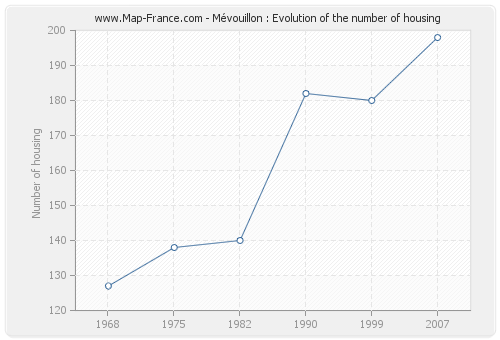 The number of housing of Mévouillon was 198 in 2007, 180 in 1999, 182 in 1990, 140 in 1982, 138 in 1975 and 127 in 1968.
