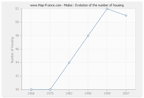 The number of housing of Mialos was 51 in 2007, 52 in 1999, 48 in 1990, 44 in 1982, 40 in 1975 and 40 in 1968.