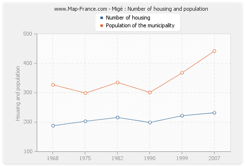 The population of Migé was 442 inhabitants in 2007, 368 inhabitants in 1999, 301 inhabitants in 1990, 335 inhabitants in 1982, 299 inhabitants in 1975 and 327 inhabitants in 1968. Meanwhile, the number of housing of Migé was 232 in 2007, 222 in 1999, 199 in 1990, 216 in 1982, 203 in 1975 and 188 in 1968.
