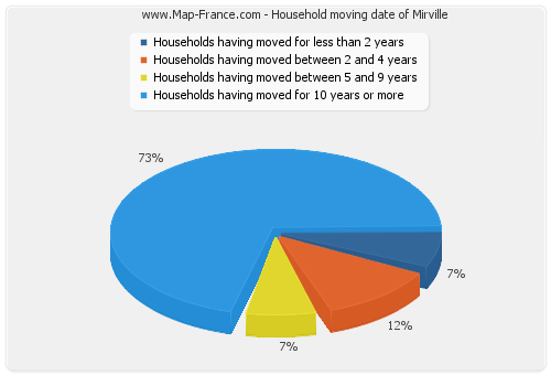 - Number of households of Mirville having moved between 2 and 5 years : 13 - Number of households of Mirville having moved between 5 and 9 years : 8 - Number of households of Mirville having moved for 10 years or more : 80 |