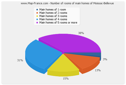 - Number of main homes of Moissac-Bellevue of 1 room : 4 - Number of main homes of Moissac-Bellevue of 2 rooms : 18 - Number of main homes of Moissac-Bellevue of 3 rooms : 20 - Number of main homes of Moissac-Bellevue of 4 rooms : 20 - Number of main homes of Moissac-Bellevue of 5 rooms and more : 51 |