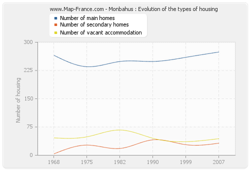 The following graphs show the history of the number and the type of housing of Monbahus from 1968 to 2007. The second graph is drawn in cubic interpolation. This allows to obtain more exactly the number of accommodation of the town of Monbahus years where no inventory was made.