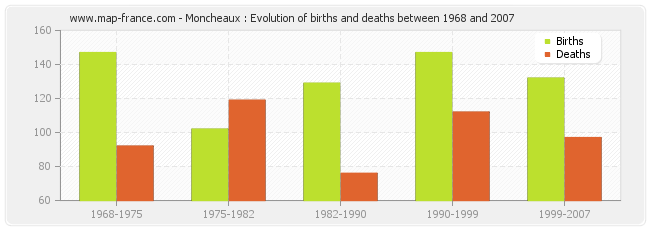 Moncheaux : evolution of births and deaths from 1968 to 2007