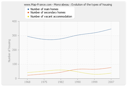 The following graphs show the history of the number and the type of housing of Moncrabeau from 1968 to 2007. The second graph is drawn in cubic interpolation. This allows to obtain more exactly the number of accommodation of the town of Moncrabeau years where no inventory was made.