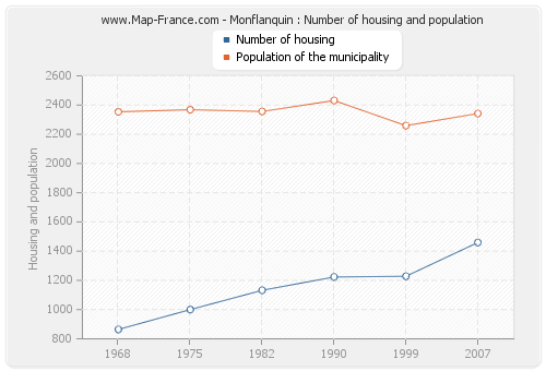 The population of Monflanquin was 2 342 inhabitants in 2007, 2 259 inhabitants in 1999, 2 431 inhabitants in 1990, 2 356 inhabitants in 1982, 2 368 inhabitants in 1975 and 2 354 inhabitants in 1968. Meanwhile, the number of housing of Monflanquin was 1 459 in 2007, 1 228 in 1999, 1 223 in 1990, 1 132 in 1982, 1 000 in 1975 and 864 in 1968.