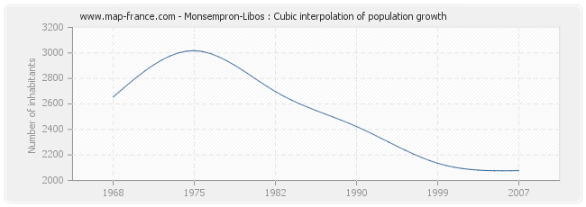 This curve shows the history of the population of Monsempron-Libos from 1968 to 2007 in cubic interpolation. This provides more precisely the population of the municipality of Monsempron-Libos the years where no census has been taken.