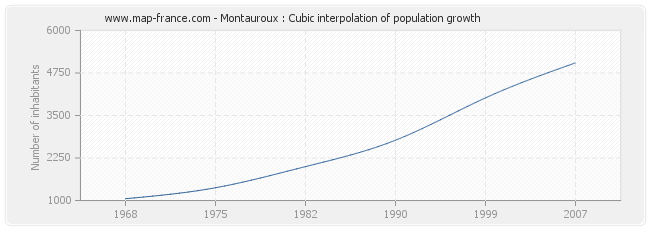 This curve shows the history of the population of Montauroux from 1968 to 2007 in cubic interpolation. This provides more precisely the population of the municipality of Montauroux the years where no census has been taken.