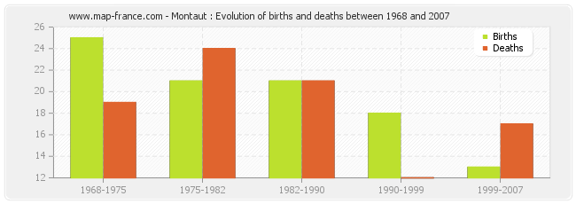 Population of Montaut was 228 inhabitants in 2007, 207 inhabitants in 1999, 207 inhabitants in 1990, 253 inhabitants in 1982, 265 inhabitants in 1975 and 294 inhabitants in 1968.