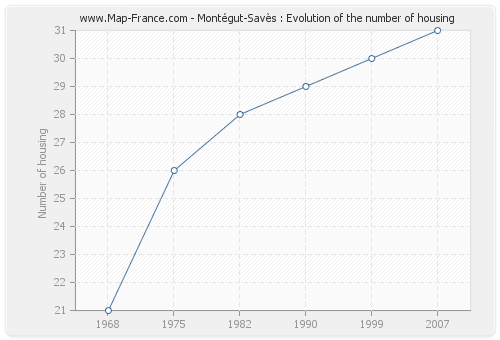 The number of housing of Montégut-Savès was 31 in 2007, 30 in 1999, 29 in 1990, 28 in 1982, 26 in 1975 and 21 in 1968.