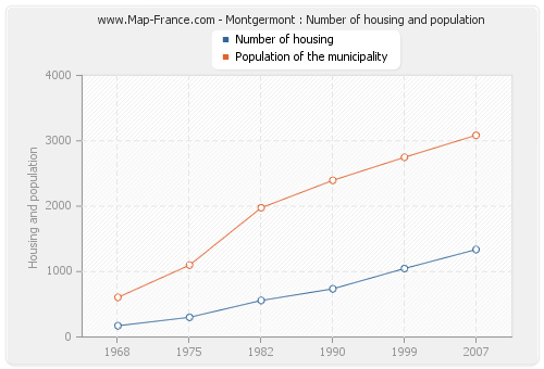 The population of Montgermont was 3 085 inhabitants in 2007, 2 748 inhabitants in 1999, 2 395 inhabitants in 1990, 1 976 inhabitants in 1982, 1 099 inhabitants in 1975 and 606 inhabitants in 1968. Meanwhile, the number of housing of Montgermont was 1 337 in 2007, 1 047 in 1999, 736 in 1990, 558 in 1982, 301 in 1975 and 172 in 1968.
