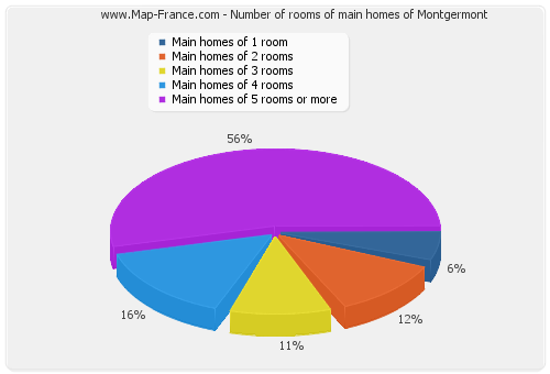 - Number of main homes of Montgermont of 1 room : 78 - Number of main homes of Montgermont of 2 rooms : 153 - Number of main homes of Montgermont of 3 rooms : 139 - Number of main homes of Montgermont of 4 rooms : 139 - Number of main homes of Montgermont of 5 rooms and more : 721 |