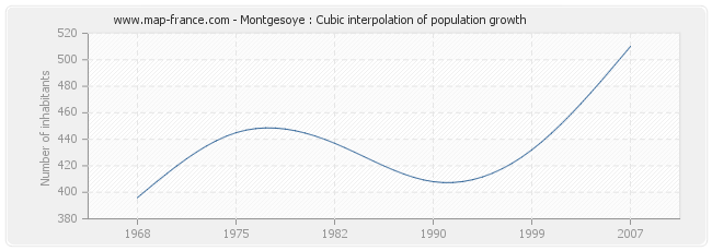 Population of Montgesoye was 510 inhabitants in 2007, 432 inhabitants in 1999, 408 inhabitants in 1990, 437 inhabitants in 1982, 445 inhabitants in 1975 and 396 inhabitants in 1968.