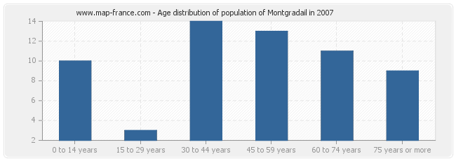 - Population of Montgradail from 30 to 44 years : 14 inhabitants