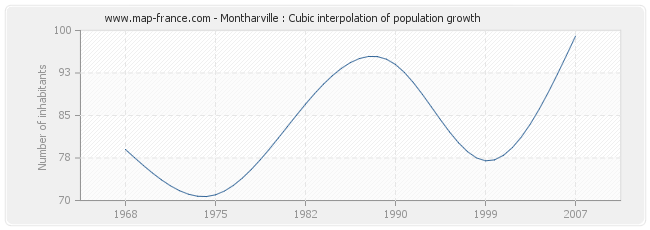 This curve shows the history of the population of Montharville from 1968 to 2007 in cubic interpolation. This provides more precisely the population of the municipality of Montharville the years where no census has been taken.