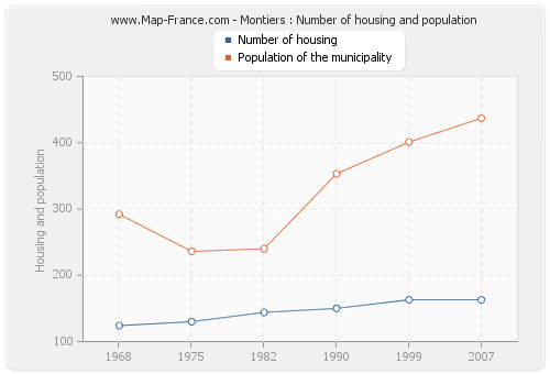 The population of Montiers was 437 inhabitants in 2007, 401 inhabitants in 1999, 353 inhabitants in 1990, 240 inhabitants in 1982, 236 inhabitants in 1975 and 292 inhabitants in 1968. Meanwhile, the number of housing of Montiers was 163 in 2007, 163 in 1999, 150 in 1990, 144 in 1982, 130 in 1975 and 124 in 1968.