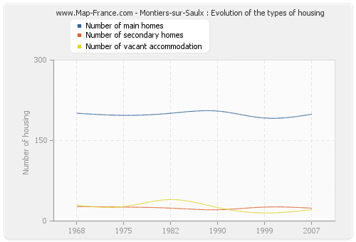 The following graphs show the history of the number and the type of housing of Montiers-sur-Saulx from 1968 to 2007. The second graph is drawn in cubic interpolation. This allows to obtain more exactly the number of accommodation of the town of Montiers-sur-Saulx years where no inventory was made.