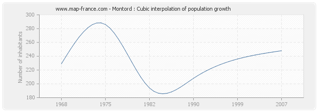 This curve shows the history of the population of Montord from 1968 to 2007 in cubic interpolation. This provides more precisely the population of the municipality of Montord the years where no census has been taken.