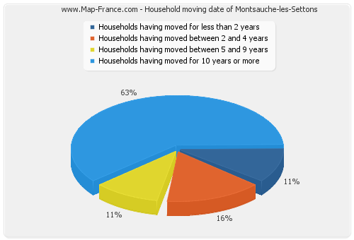 - Number of households of Montsauche-les-Settons having moved between 2 and 5 years : 45 - Number of households of Montsauche-les-Settons having moved between 5 and 9 years : 31 - Number of households of Montsauche-les-Settons having moved for 10 years or more : 182 |